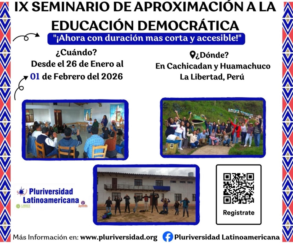 Desde el Colectivo Pluriversidad Latinoamericana en cooperación con la Biblioteca Comunitaria Cullechuco en Cachicadan y la Escuela Democrática de Huamachuco tenemos el inmenso agrado de invitarles a compartir un espacio de encuentro y construcción colectiva de aprendizajes, donde compartiremos experiencias de años anteriores y nuevas propuestas que promoverán la transformación individual y colectiva de los participantes.